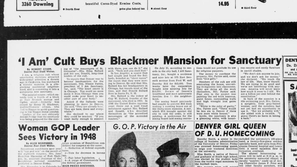 Among other conditions, Ballard’s credos required followers to abstain from ‘worldly degradations’; to pledge loyalty to him in exchange for immortality; and to embrace nationalism. In Denver, U.S. flags are continuously flown in the front and back yards of the sanctuary.