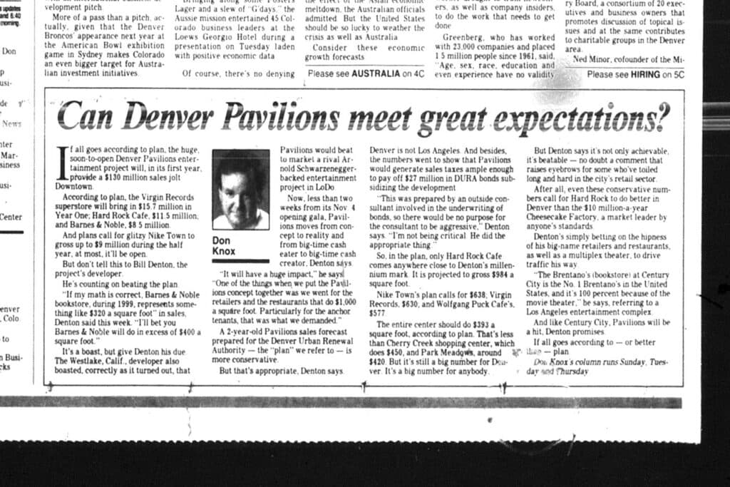 "I think this is going to be a home run," William Denton, a developer behind Pavilions, told the Rocky in 1994. "Denver has been locked in a Catch-22. You need good retail to attract good retail. We will take on that responsibility."