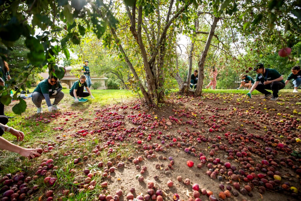 Her army of helpers, who came to her from the Junior League of Denver, were gobsmacked by the scene. An enormous yard, surrounding a modern mansion, was littered with apples that had already fallen from their branches. There were only a few trees at the edge of the lawn, but even more fruit hung above their heads, sumptuous orbs of red and pink and green.
