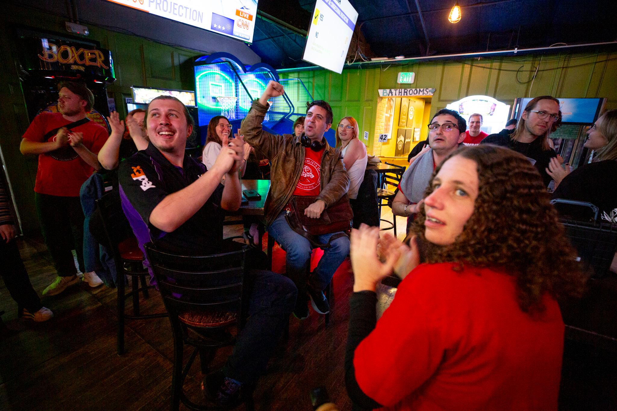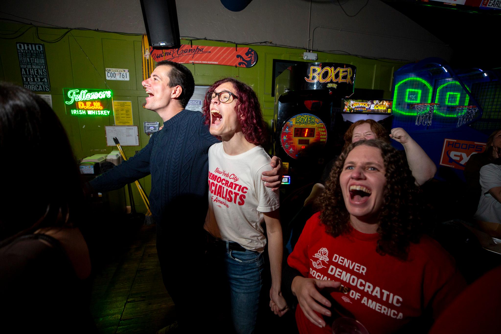 Late on Election Day, the downtown Stoney’s Bar and Grill was split between two groups — Colorado Avalanche fans and dozens of democratic socialists.