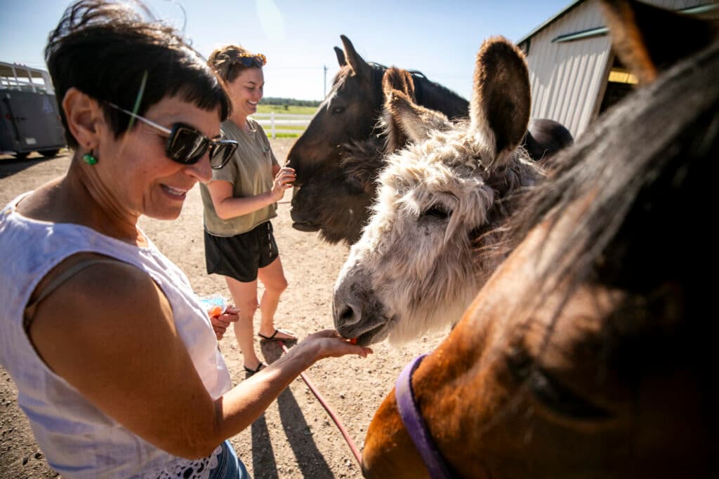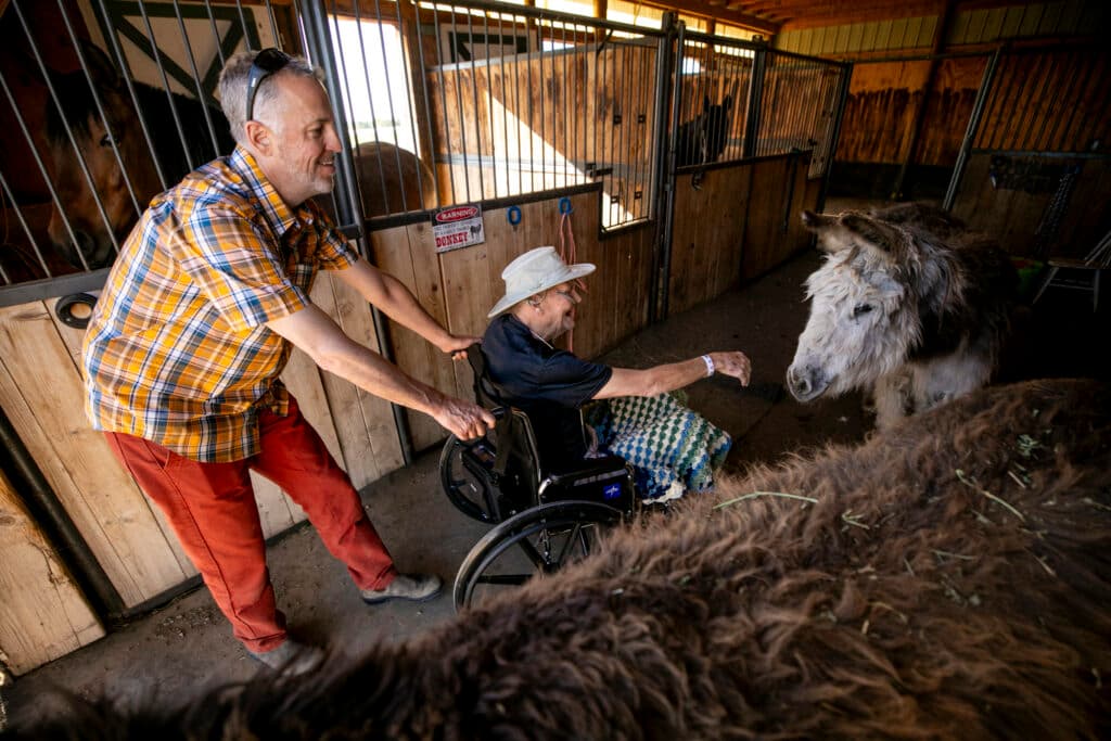Todd helped his brother into a wheelchair. Then Jepsen rolled him toward a pack of furry donkeys waiting to greet him. Hartley cackled in delight as they clamored for treats and sniffed his hand.