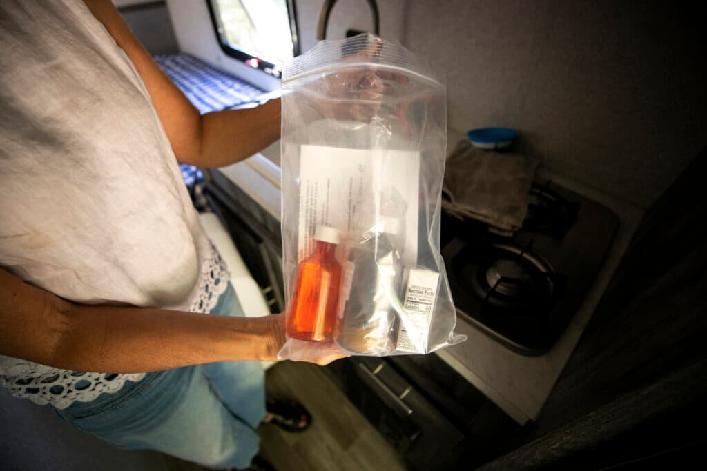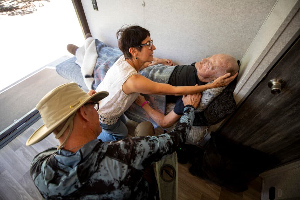 Todd and Susan helped him into the trailer and tucked him into the bed, then handed him a bottle of medication topped with a straw. Hartley drank it without hesitation. It burned, he said, as Susan fed him a chaser of mango sorbet.