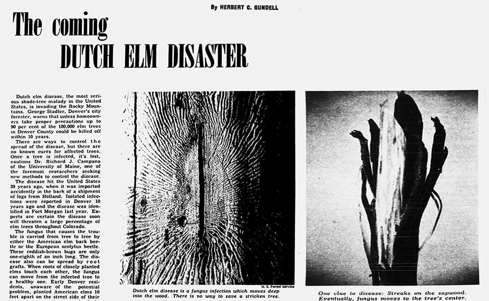 It was reported on as early as 1948. "Dutch Elm Disease Perils 100,000 trees in Denver," reads the headline of one article in the Denver Post that year. "No means of preventing elms from being infected...is known," it said. "Horticulturalists are concerned because a great many of the elms found in Denver have been imported from Kansas City where the disease has made rapid progress."