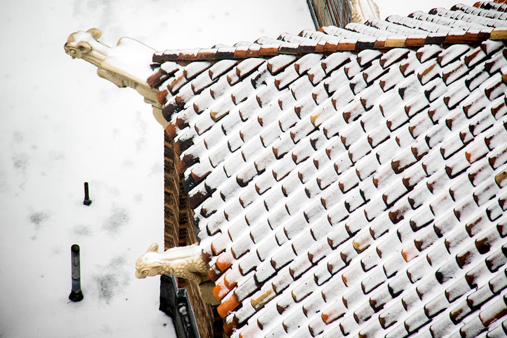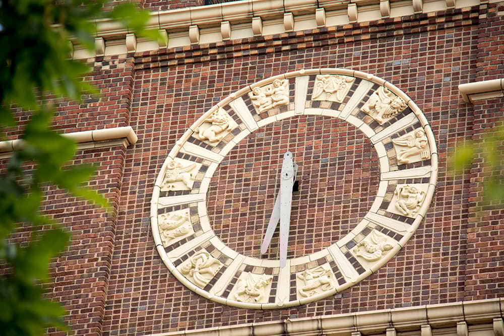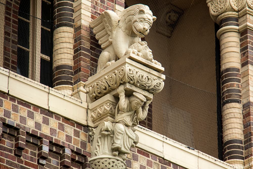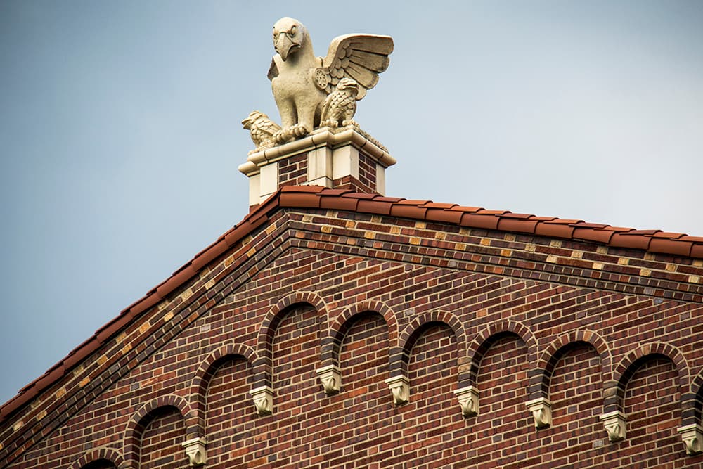 Atop the main entrance is a sentinel griffin known as "Gertie Gargoyle." The school also features a massive clock with zodiac symbols and at least two severed heads beneath the feet of winged lions that are said to symbolize final exams.