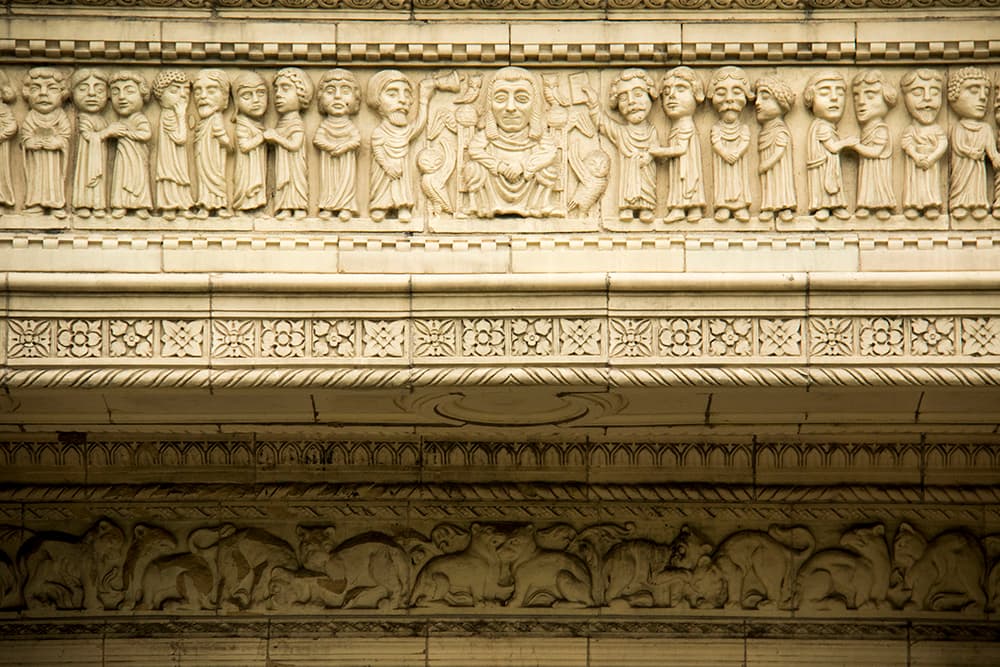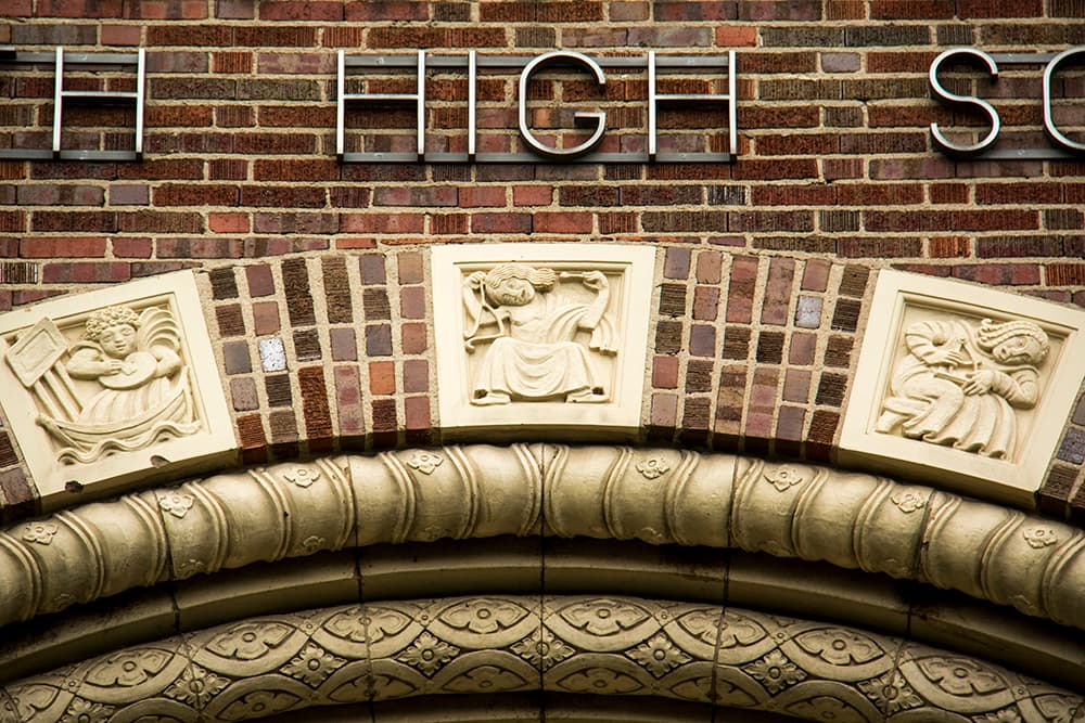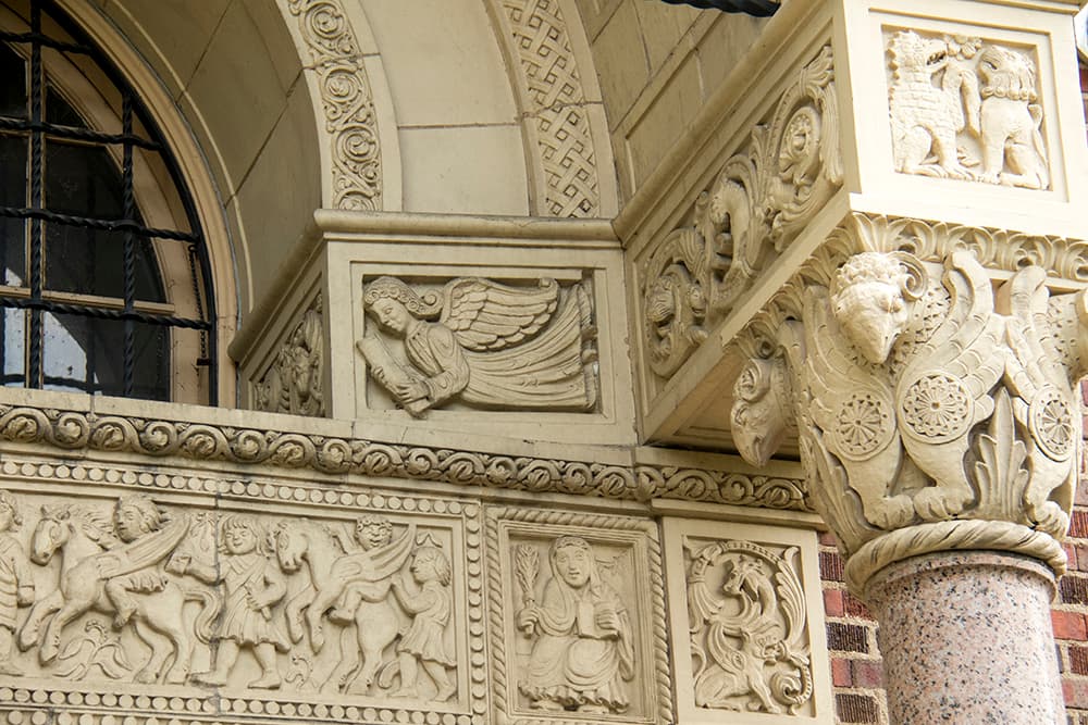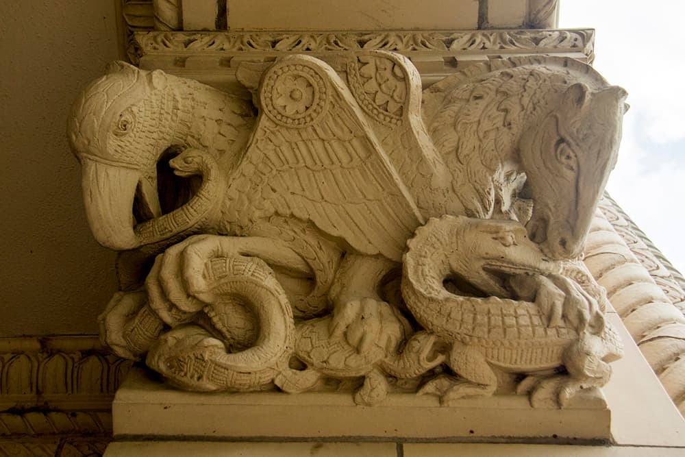 Indeed, what seems to be Garrison's odd sense of humor also permeated his work on South High. One scene above the main entrance depicts a griffin eating a snake that's also being eaten by a fanged fish next to a turtle that's being stepped on and nipping a dragon that's biting a horse. The entryway features a medieval-style scene of teachers flanking a most distinguished principal. Below him is an assortment of beasts that the school's official history says "symbolize unscholarly behavior such as rubber-band shooting and gum chewing."
